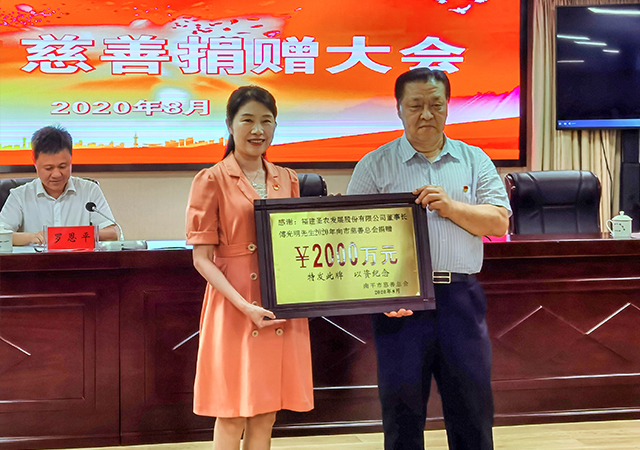 2008年初,南平市慈善總會(huì)籌建期間,傅光明董事長(zhǎng)第一次向慈善總會(huì)捐贈(zèng)1000萬元。2008年4月20日,南平市慈善總會(huì)召開成立大會(huì)和第一次會(huì)員大會(huì),他眾望所歸擔(dān)任會(huì)長(zhǎng),并被南平市政府授予“慈善家”稱號(hào)。會(huì)上,他承諾,將以每年1000萬元的額度,向慈善總會(huì)連續(xù)捐贈(zèng)20年。此后,他一諾千金,2008年—2017年,每年捐贈(zèng)給慈善總會(huì)1000萬元善款,累計(jì)達(dá)1億元。