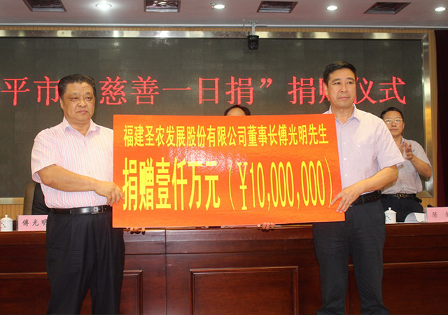 2015年8月11日,在南平市舉行的“慈善一日捐”捐贈(zèng)儀式上,南平市慈善總會(huì)會(huì)長(zhǎng)、圣農(nóng)發(fā)展股份有限公司董事長(zhǎng)傅光明再次以個(gè)人名義捐贈(zèng)1000萬(wàn)元。他承諾,將以每年1000萬(wàn)元的額度,向該會(huì)連續(xù)捐贈(zèng)20年。他是這么說(shuō)的,也是這么做的,迄今為止,已連續(xù)八年向市慈善總會(huì)捐款8000萬(wàn)元。
